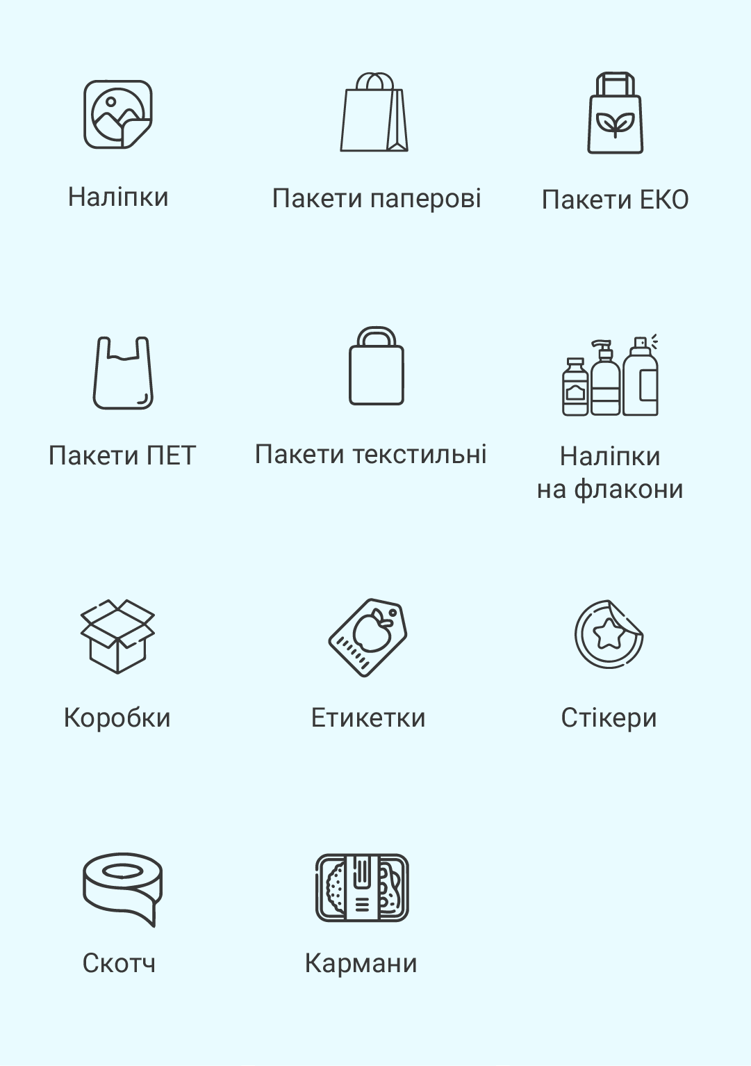 Наше об’єднання типографій має декілька десятків виробництв, технологій, друкувальних машин, постдрукувальних приладів, як стандартних, так і спеціалізованих, на яких можна виготовляти різну упаковку. Якщо Ви точно знаєте, що ви хочете отримати в результаті замовлення, надайте нам технічне завдання, ми знайдемо найекономічніший спосіб його виготовлення. Якщо ні, то наша команда талановитих технологів та інженерів допоможе Вам розробити оптимальний метод реалізації завдання.