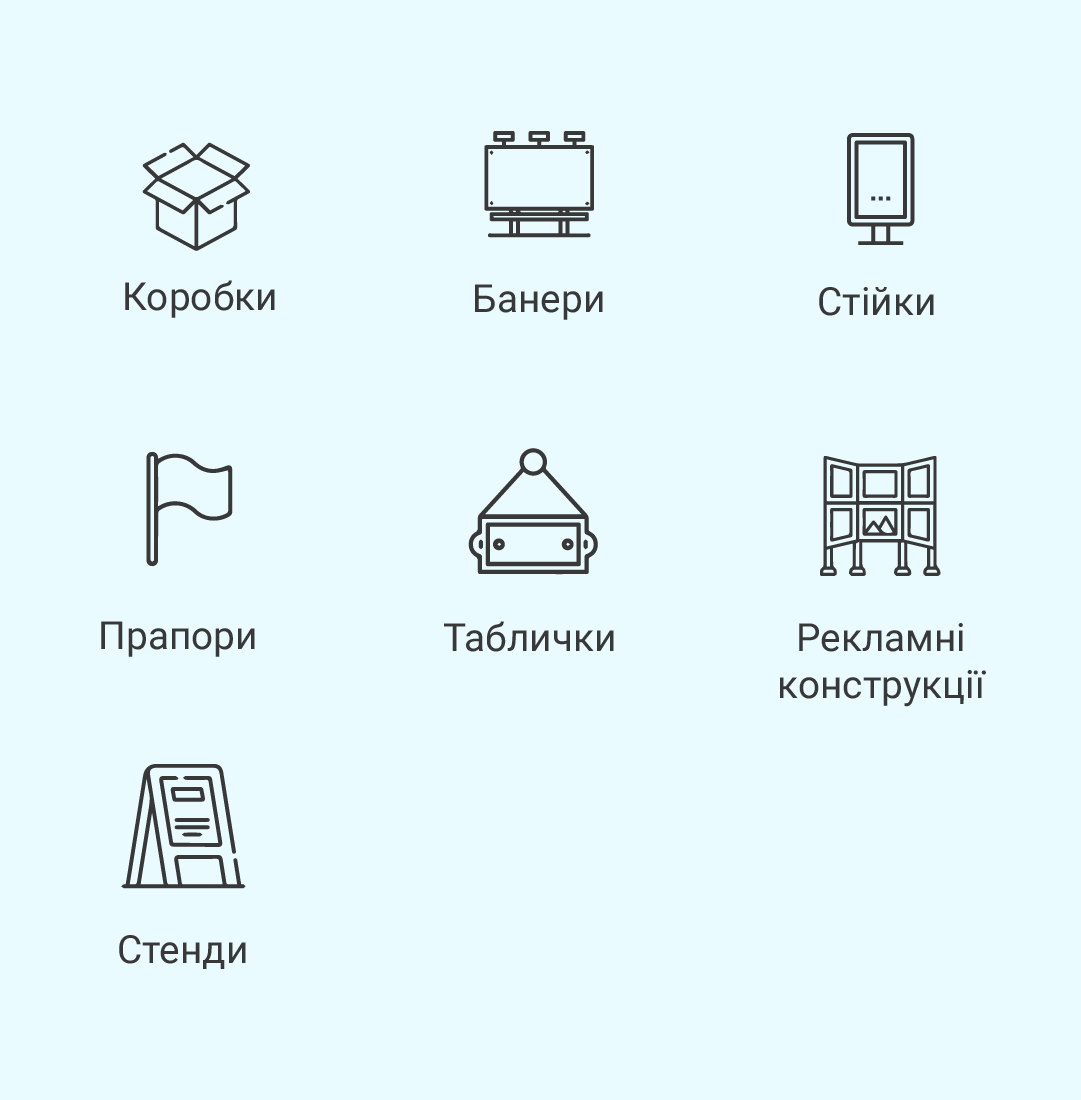 - Рекламні стенди: Це портативні конструкції, які служать основою для розміщення банерів, плакатів або іншої рекламної графіки. Рекламні стенди можуть бути розкладними або рулонними, забезпечуючи легкість транспортування та монтажу. Наприклад це конструкції типу ролл-ап, поп-ап, L-банер, павук, штендер та інші.